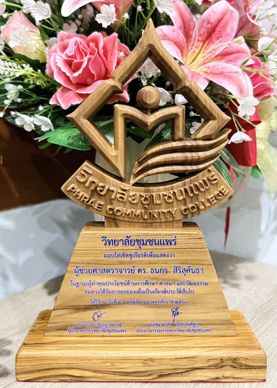 ประธานหลักสูตร กจ.ม. สาขาวิชาการจัดการ ม.ราชภัฏลำปาง รับโล่เชิดชูเกียรติผู้ทำคุณประโยชน์ด้านการศึกษา ศาสนา และวัฒนธรรม ในพิธีประสาทอนุปริญญาบัตร วชช.แพร่