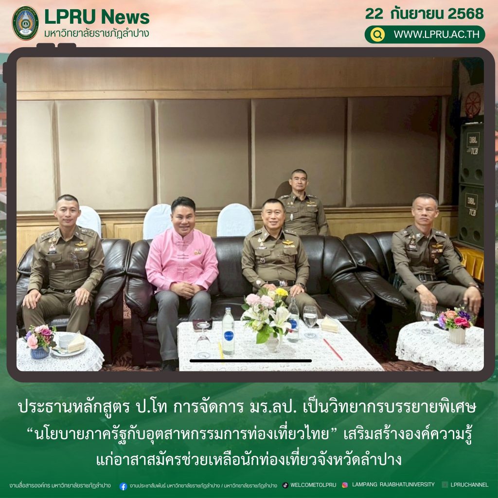 ประธานหลักสูตร ป.โท การจัดการ มร.ลป. เป็นวิทยากรบรรยายพิเศษ “นโยบายภาครัฐกับอุตสาหกรรมการท่องเที่ยวไทย” เสริมสร้างองค์ความรู้แก่อาสาสมัครช่วยเหลือนักท่องเที่ยวจังหวัดลำปาง Leave a Comment / ข่าว2568, ข่าวเดือนกันยายน 68 / เคลือนรงค์ หน่อคำ LPRU News : เมื่อวันที่ 21 ประธานหลักสูตร ป.โท การจัดการ มร.ลป. เป็นวิทยากรบรรยายพิเศษ “นโยบายภาครัฐกับอุตสาหกรรมการท่องเที่ยวไทย” เสริมสร้างองค์ความรู้แก่อาสาสมัครช่วยเหลือนักท่องเที่ยวจังหวัดลำปาง Read More »