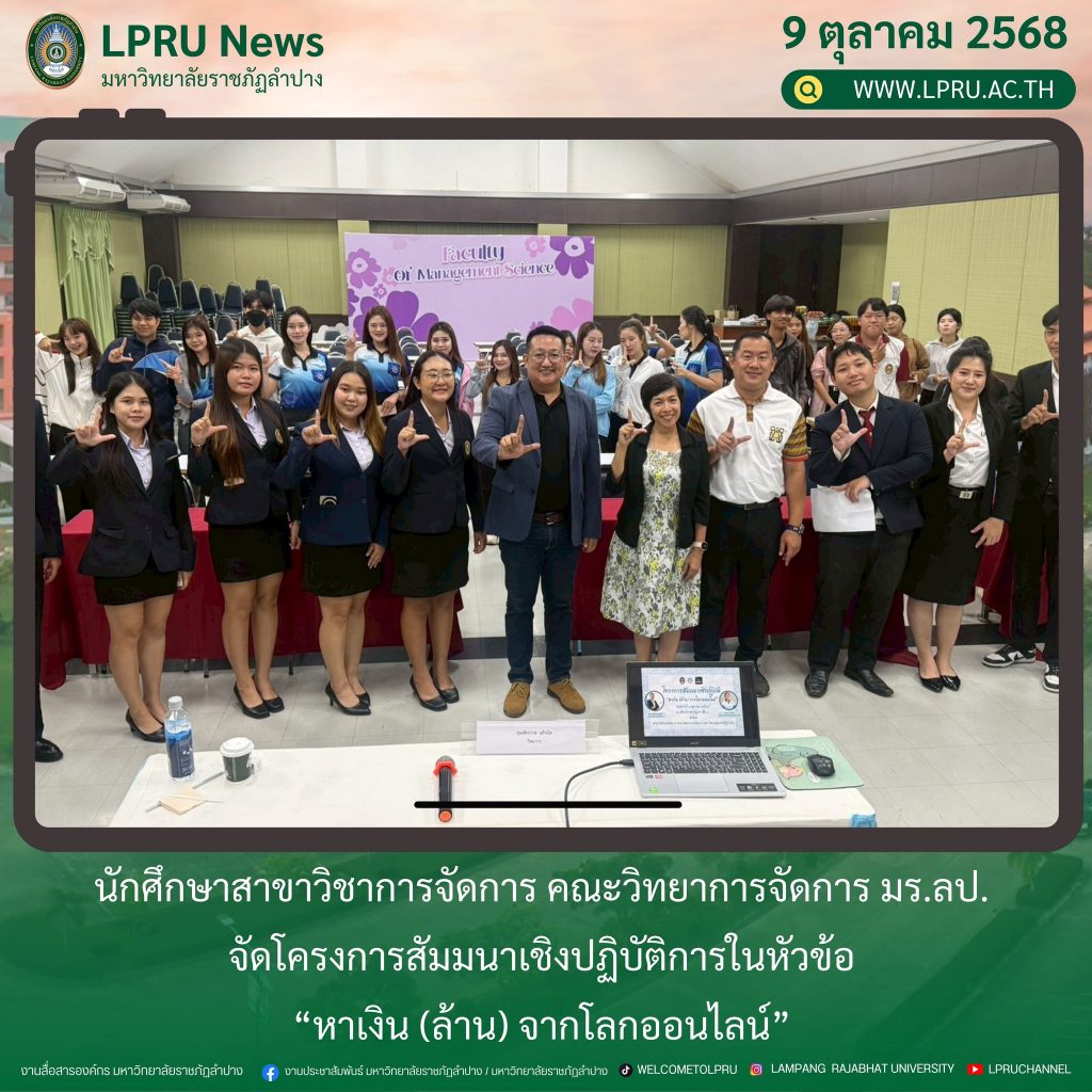 นักศึกษาสาขาวิชาการจัดการ คณะวิทยาการจัดการ มร.ลป. จัดโครงการสัมมนาเชิงปฏิบัติการในหัวข้อ “หาเงิน (ล้าน) จากโลกออนไลน์” Leave a Comment / ข่าวเดือนตุลาคม 68 / เคลือนรงค์ หน่อคำ PRU NEWs : เมื่อวันที่ 3 ตุลาคม 25 นักศึกษาสาขาวิชาการจัดการ คณะวิทยาการจัดการ มร.ลป. จัดโครงการสัมมนาเชิงปฏิบัติการในหัวข้อ “หาเงิน (ล้าน) จากโลกออนไลน์” Read More »