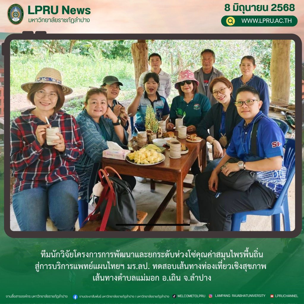 ทีมนักวิจัยโครงการการพัฒนาและยกระดับห่วงโซ่คุณค่าสมุนไพรพื้นถิ่นสู่การบริการแพทย์แผนไทยฯ มร.ลป. ทดสอบเส้นทางท่องเที่ยวเชิงสุขภาพ เส้นทางตำบลแม่มอก อ.เถิน จ.ลำปาง