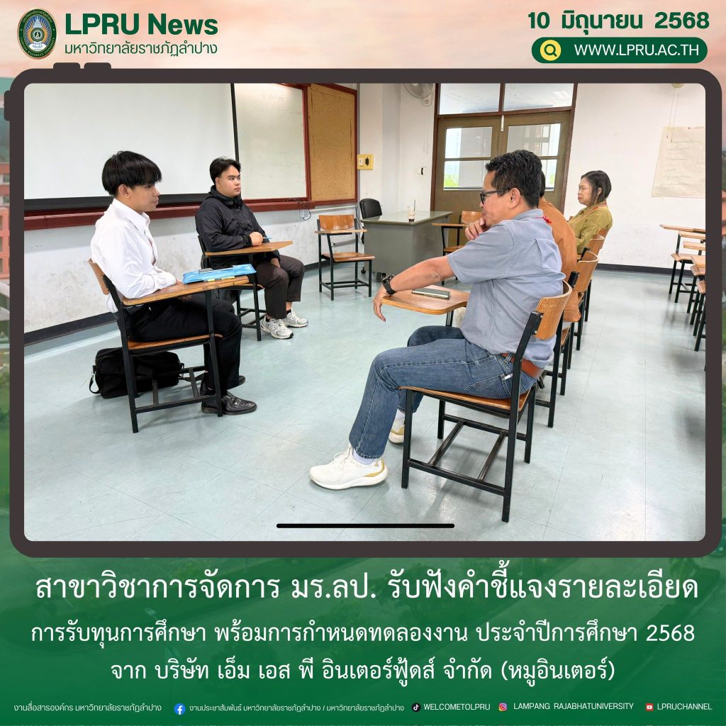 สาขาวิชาการจัดการ มร.ลป. รับฟังคำชี้แจงรายละเอียดการรับทุนการศึกษา พร้อมการกำหนดทดลองงาน ประจำปีการศึกษา 2568 จาก บริษัท เอ็ม เอส พี อินเตอร์ฟู้ดส์ จำกัด (หมูอินเตอร์)