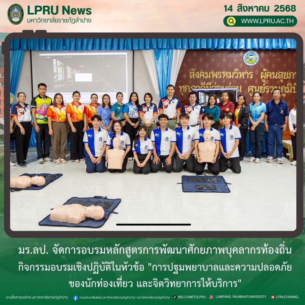 มร.ลป. จัดการอบรมหลักสูตรการพัฒนาศักยภาพบุคลากรท้องถิ่น กิจกรรมอบรมเชิงปฏิบัติในหัวข้อ “การปฐมพยาบาลและความปลอดภัยของนักท่องเที่ยว และจิตวิทยาการให้บริการ” Leave a Comment / ข่าว2568, ข่าวเดือนสิงหาคม 68 / เคลือนรงค์ หน่อคำ LPRU News : เมื่อวันที่ 13 มร.ลป. จัดการอบรมหลักสูตรการพัฒนาศักยภาพบุคลากรท้องถิ่น กิจกรรมอบรมเชิงปฏิบัติในหัวข้อ “การปฐมพยาบาลและความปลอดภัยของนักท่องเที่ยว และจิตวิทยาการให้บริการ” Read More »