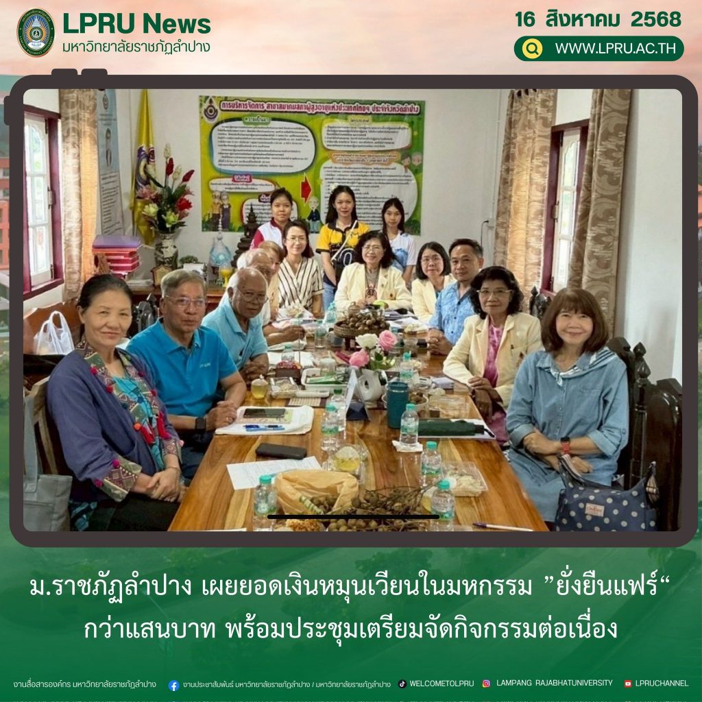 ม.ราชภัฏลำปาง เผยยอดเงินหมุนเวียนในมหกรรม ”ยั่งยืนแฟร์“ กว่าแสนบาท พร้อมประชุมเตรียมจัดกิจกรรมต่อเนื่อง Leave a Comment / ข่าว2568, ข่าวเดือนสิงหาคม 68 / เคลือนรงค์ หน่อคำ LPRU News : ผศ.ดร.ขจรศักดิ์ วงศ์วิราช อาจ ม.ราชภัฏลำปาง เผยยอดเงินหมุนเวียนในมหกรรม ”ยั่งยืนแฟร์“ กว่าแสนบาท พร้อมประชุมเตรียมจัดกิจกรรมต่อเนื่อง Read More »