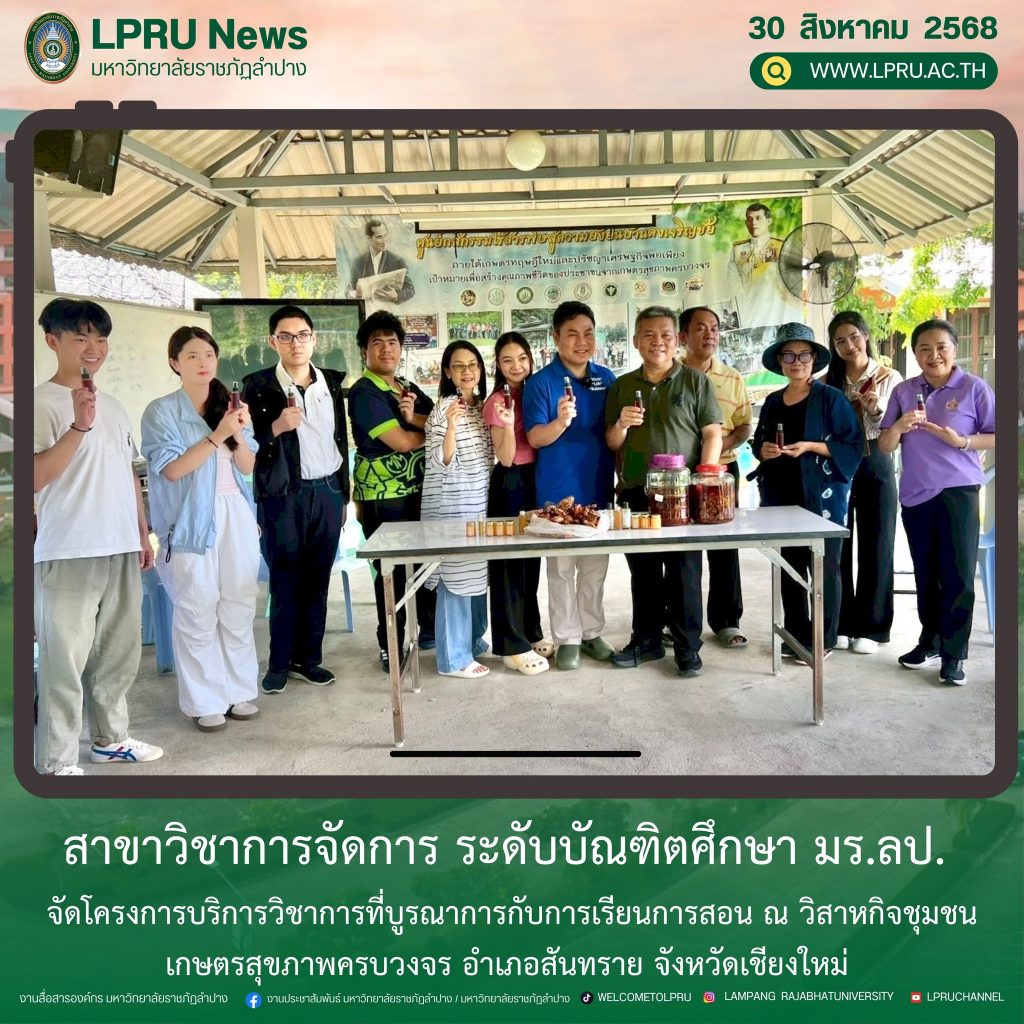 สาขาวิชาการจัดการ ระดับบัณฑิตศึกษา มร.ลป. จัดโครงการบริการวิชาการที่บูรณาการกับการเรียนการสอน ณ วิสาหกิจชุมชนเกษตรสุขภาพครบวงจร อำเภอสันทราย จังหวัดเชียงใหม่ Leave a Comment / ข่าว2568, ข่าวเดือนสิงหาคม 68 / เคลือนรงค์ หน่อคำ LPRU News : เมื่อวัน สาขาวิชาการจัดการ ระดับบัณฑิตศึกษา มร.ลป. จัดโครงการบริการวิชาการที่บูรณาการกับการเรียนการสอน ณ วิสาหกิจชุมชนเกษตรสุขภาพครบวงจร อำเภอสันทราย จังหวัดเชียงใหม่ Read More »