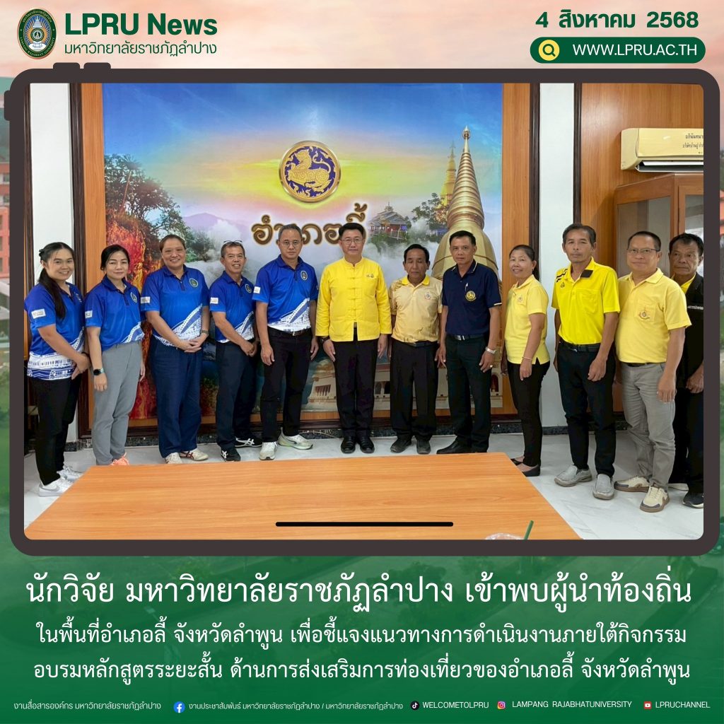 นักวิจัย มร.ลป. เข้าพบผู้นำท้องถิ่นในพื้นที่อำเภอลี้ จังหวัดลำพูน เพื่อชี้แจงแนวทางการดำเนินงานภายใต้กิจกรรมอบรมหลักสูตรระยะสั้น ด้านการส่งเสริมการท่องเที่ยวของอำเภอลี้ จังหวัดลำพูน Leave a Comment / ข่าว2568, ข่าวเดือนสิงหาคม 68 / เคลือนรงค์ หน่อคำ LPRU News : เมื่อวันที่ นักวิจัย มร.ลป. เข้าพบผู้นำท้องถิ่นในพื้นที่อำเภอลี้ จังหวัดลำพูน เพื่อชี้แจงแนวทางการดำเนินงานภายใต้กิจกรรมอบรมหลักสูตรระยะสั้น ด้านการส่งเสริมการท่องเที่ยวของอำเภอลี้ จังหวัดลำพูน Read More »