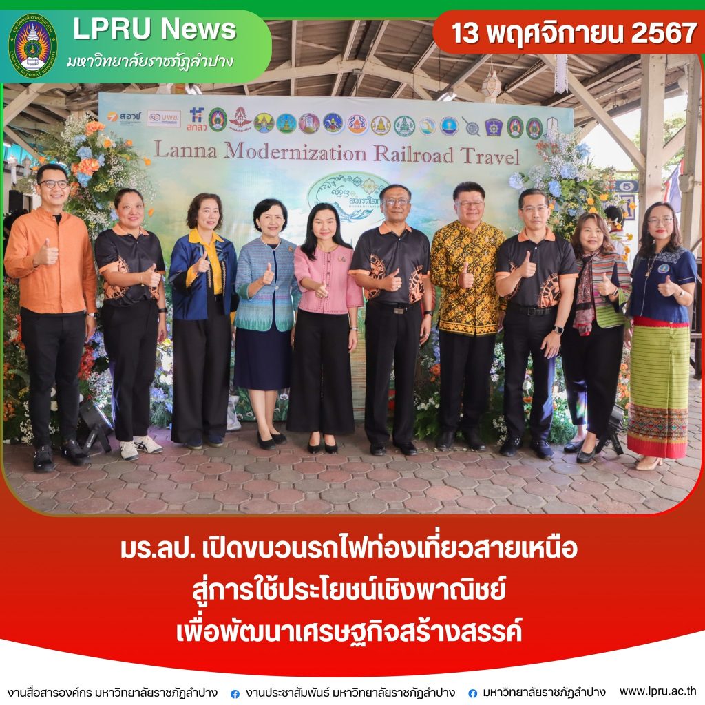 LPRU NEWs : เมื่อวันที่ 13 พฤศจิกายน 2567 รศ.ดร.กิตติศักดิ์ สมุทธารักษ์ อธิการบดีมหาวิทยาลัยราชภัฏลำปาง กล่าวรายงานการนำผลงานวิจัยการท่องเที่ยวโดยรถไฟสายเหนือสู่การใช้ประโยชน์เชิงพาณิชย์ เพื่อพัฒนาเศรษฐกิจสร้างสรรค์ ณ สถานีรถไฟนครลำปาง อ.เมืองลำปาง จ.ลำปาง โดยมีนางสาววราภรณ์ รุ่งตระการ ที่ปรึกษาด้านระบบบริหารการอุดมศึกษา วิทยาศาสตร์ วิจัยและนวัตกรรม สำนักงานปลัดกระทรวงการอุดมศึกษา วิทยาศาสตร์ วิจัยและนวัตกรรม (อว.) รักษาราชการแทนรองปลัดกระทรวง อว. เป็นประธานในพิธีเปิดขบวนรถไฟท่องเที่ยวสายเหนือ ตามโครงการวิจัยการนำผลงานวิจัยการท่องเที่ยวโดยรถไฟสายเหนือมาสู่การใช้ประโยชน์เชิงพาณิชย์ เพื่อพัฒนาเศรษฐกิจสร้างสรรค์ โดยมี นายศิริวัฒน์ บุปผาเจริญ ผู้ว่าราชการ จ.อุตรดิตถ์ นางสาวนิติยา พงษ์พานิช รองผู้ว่าราชการ จ.ลำปาง นายกฤษณะ พินิจ รองผู้ว่าราชการ จ.ลำปาง นายทรงพล วิชัยขัทคะ รองผู้ว่าราชการ จ.พิษณุโลก น.ส.สรินรัตน์ เกิดสกุลรุ่งโรจน์ รองผู้ว่าราชการ จ.สุโขทัย นายชาตรี ธินนท์ รองผู้ว่าราชการ จ.ลำพูน ผศ.สุภาวดี โพธิยะราช ผู้เชี่ยวชาญอาวุโส สำนักงานคณะกรรมการส่งเสริมวิทยาศาสตร์ วิจัยและนวัตกรรม (สกสว.) และประธานคณะอนุกรรมการแผนงานการท่องเที่ยวและเศรษฐกิจสร้างสรรค์ ผู้บริหาร คณาจารย์ นักวิจัยโครงการฯ นักศึกษา มหาวิทยาลัยราชภัฏลำปาง และนักท่องเที่ยวเข้าร่วมกิจกรรม