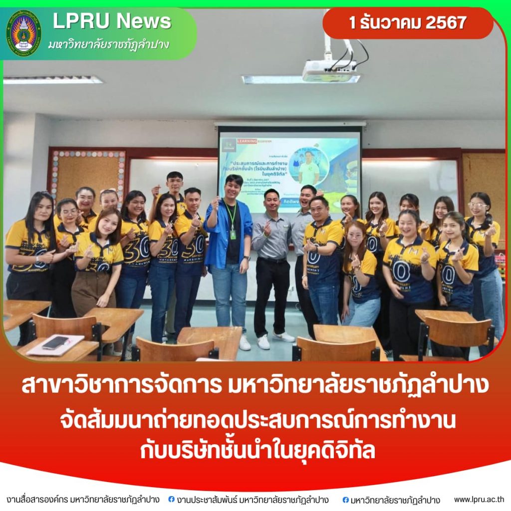 LPRU News : รศ.ดร.ภัทรธิดา วัฒนาพรรณกิตติ ประธานสาขาวิชาการจัดการ คณะวิทยาการจัดการ เปิดเผยว่า เมื่อวันที่ 1 ธันวาคม 2567 สาขาวิชาการจัดการได้จัดกิจกรรมการสัมมนาในหัวข้อ “ประสบการณ์และการทำงานกับบริษัทชั้นนำ (โรบินสันลำปาง) ในยุคดิจิทัล” ณ ห้องเรียน 3855 อาคารโอฬาร โรจน์หิรัญ มหาวิทยาลัยราชภัฏลำปาง