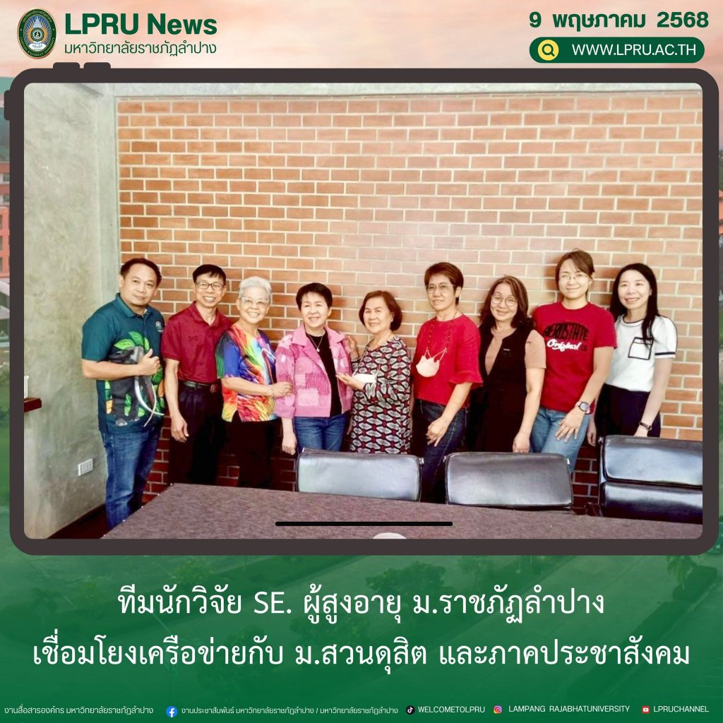 LPRU News : ผศ.ดร.ขจรศักดิ์ วงศ์วิราช อาจารย์สังกัดสาขาวิชาการจัดการ คณะวิทยาการจัดการ มหาวิทยาลัยราชภัฏลำปาง ในฐานะหัวหน้าโครงการวิจัยธุรกิจเพื่อสังคมที่สร้างโอกาสทางเศรษฐกิจสำหรับผู้สูงอายุจังหวัดลำปาง ภายใต้ทุนอุดหนุนการวิจัยจากสำนักงานการวิจัยแห่งชาติ (วช.) ประจำปีงบประมาณ 2568 เปิดเผยว่า เมื่อวันที่ 4 พฤษภาคม 2568 ทีมวิจัยประกอบด้วย ผศ.สนธิญา สุวรรณราช อาจารย์สังกัดสาขาวิชาการบัญชี ผศ.ดร.อัจฉรา เมฆสุวรรณ อาจารย์สังกัดสาขาวิชาการจัดการ อ.นลินทิพย์ กองคำ อาจารย์สังกัดสาขาวิชาการจัดการโลจิสติกส์และธุรกิจระหว่างประเทศ คณะวิทยาการจัดการ และ ผศ.อัญธิชา รุ่งแสง อาจารย์สังกัดสาขาวิชาการเมืองและการปกครอง คณะมนุษยศาสตร์และสังคมศาสตร์ เข้าร่วมการประชุมหารือในประเด็นการเชื่อมโยงเครือข่ายเพื่อพัฒนาธุรกิจเพื่อสังคมร่วมกับมหาวิทยาลัยสวนดุสิต ศูนย์การศึกษาลำปาง และภาคประชาสังคม ณ ห้องประชุมมหาวิทยาลัยสวนดุสิต ศูนย์การศึกษาลำปาง ร่วมกับ ดร.ขวัญนภา สุขคร ผู้อำนวยการศูนย์การศึกษานอกที่ตั้ง ลำปาง มหาวิทยาลัยสวนดุสิต คุณศิริพร ปัญญาเสน NF สสส. จังหวัดลำปาง พร้อมด้วยเครือข่ายภาคประชาสังคม สุขภาพ และผู้สูงอายุจังหวัดลำปาง ณ ห้องประชุมดุสิตา ดุสิตาคอฟฟี่ แอนด์ เบเกอรี่ SDU Library มหาวิทยาลัยสวนดุสิต ศูนย์การศึกษาลำปาง